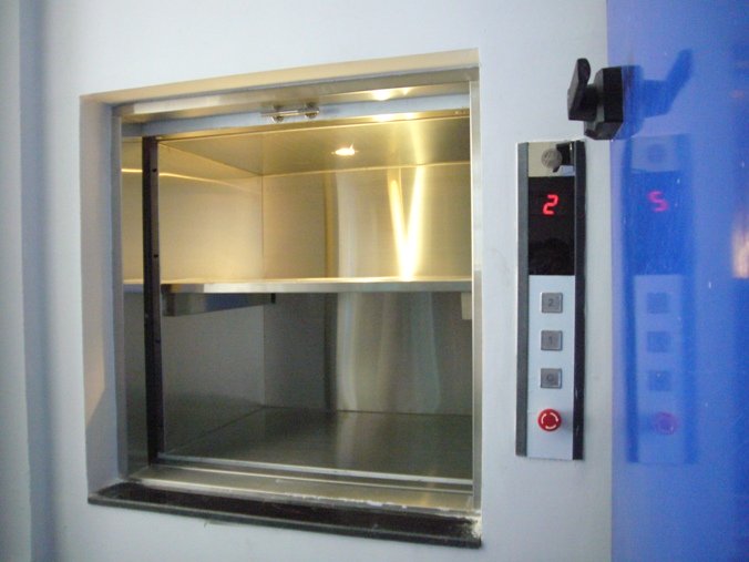 Với loại thang này, điểm dừng được thiết kế phù hợp với việc bốc dỡ hàng hóa hay thức ăn, nghĩa là khi thang dừng không cần phải bằng tầng mà phải ở 1 vị trí thuận lợi để dể dàng lấy hàng hóa từ trong thang máy ra.